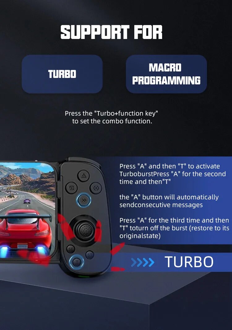 Macro programming function: It refers to the game controller being able to record and play a series of key operations. Players can record a series of key operations through specific actions, and then trigger the controller to automatically play this series of key operations by pressing a specific button or key position.